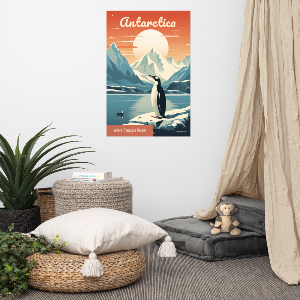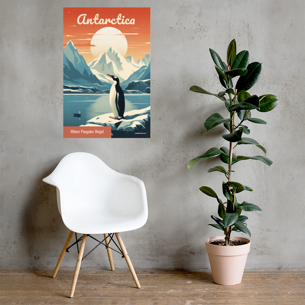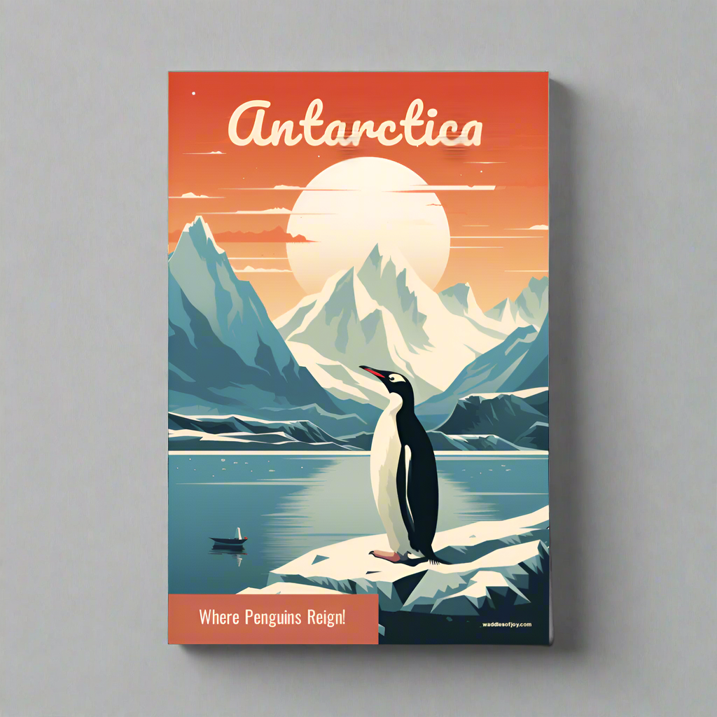 Transform your space with our captivating Antarctica Penguin Vintage Travel Poster. This museum-quality print evokes the golden age of travel posters, showcasing the breathtaking beauty of Antarctica—where penguins reign supreme. Featuring a majestic penguin against a backdrop of icy mountains and serene waters, this poster evokes a sense of wonder, adventure, and nostalgia.