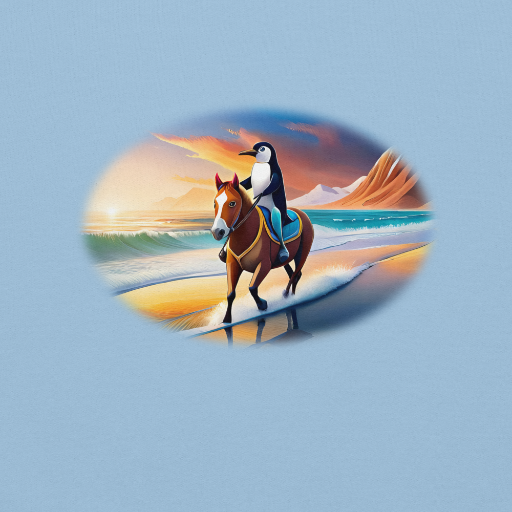 Saddle up, adventurers! Meet the Penguin Rider Hoodie—where Antarctic cool meets desert-sunset drama. Featuring a fearless penguin galloping majestically on a horse along a dreamy shoreline (yes, really), this hoodie is your passport to comfort and legend.